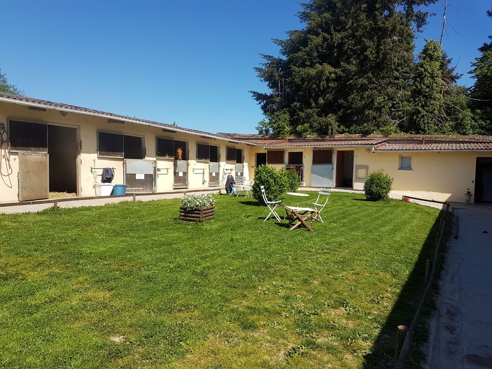 Sont à disposition des propriétaires 3 salles de soins, dont une avec lampes UV, une salle de douche et deux selleries avec casiers individuels.